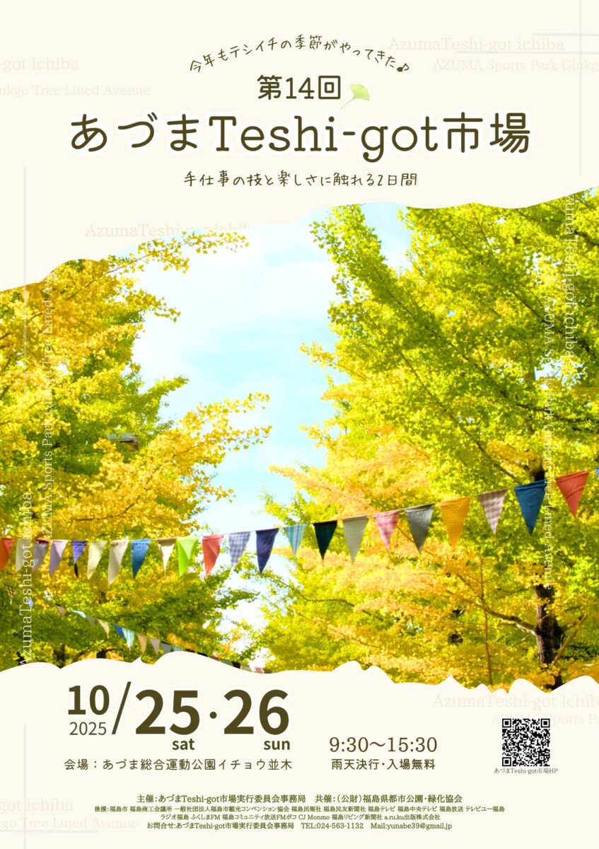 福島市・あづま総合運動公園のイチョウ並木で、2025年10月25日(土)・26日(日)に「第14回 あづま Teshi-got 市場」が開催されます。秋色に染まるイチョウ並木を歩きながら、クラフト作品や飲食ブース、ワークショップ、ステージなど多彩な企画を楽しむ二日間。入場無料で気軽に立ち寄れるイベントです。イベントの特徴と魅力