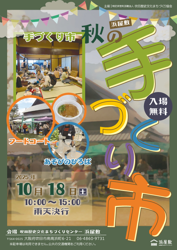 浜屋敷(吹田歴史文化まちづくりセンター「浜屋敷」)は、もとは古民家を改修した施設で、風情ある建築と日本庭園が魅力の拠点です。和室が複数あり、陶芸展覧会やギャラリー兼音楽室としての利用もされる文化的な場でもあります。会場は駅からのアクセスも比較的よく、あまり遠くない場所で自然の静けさと歴史の息づかいを感じながら歩ける立地です。秋の空気が心地よく、芝生や庭の緑が作品を引き立てる――そんな「見せ方」も場の魅力のひとつです。さらに、雨天決行で、一部は屋内(和室)ブースとしても対応予定なので、天候が変わりやすい季節でも安心して訪れられます。