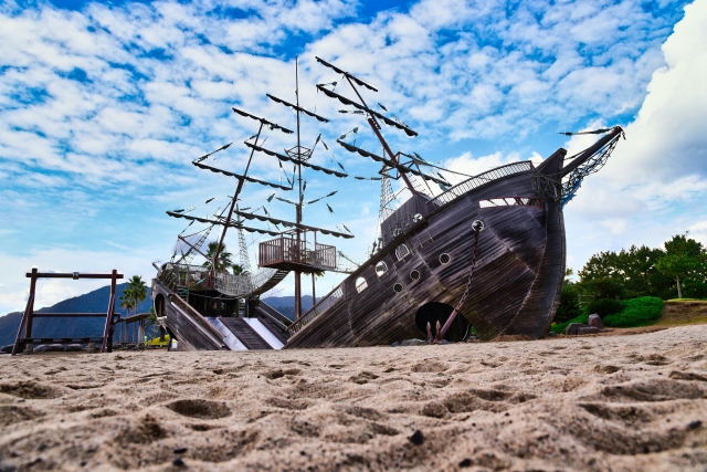 広野海岸公園は、駿河湾を臨む海岸沿いの公園で、砂浜・芝生・水場などのある開放的な環境です。会場には難破船をモチーフにした遊具、水遊びや砂遊びができるエリアも併設され、来場者がゆったり過ごせる要素も。