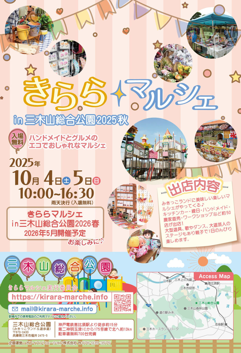 「きららマルシェin三木山総合公園」は、兵庫県三木市の豊かな自然に囲まれた総合公園を舞台に開催される屋外型マルシェです。2025年は10月4日(土)・5日(日)の2日間、手づくり雑貨やアクセサリー、木工、布小物、観葉植物、フラワーアートなど多彩なブースが大集合。さらに農家直売の野菜や果物、オーガニック食品、人気のキッチンカーが並び、グルメも充実。芝生広場では音楽やダンス、大道芸などのステージもあり、ファミリーや友人同士で1日中楽しめるイベントです。イベントの特徴と魅力