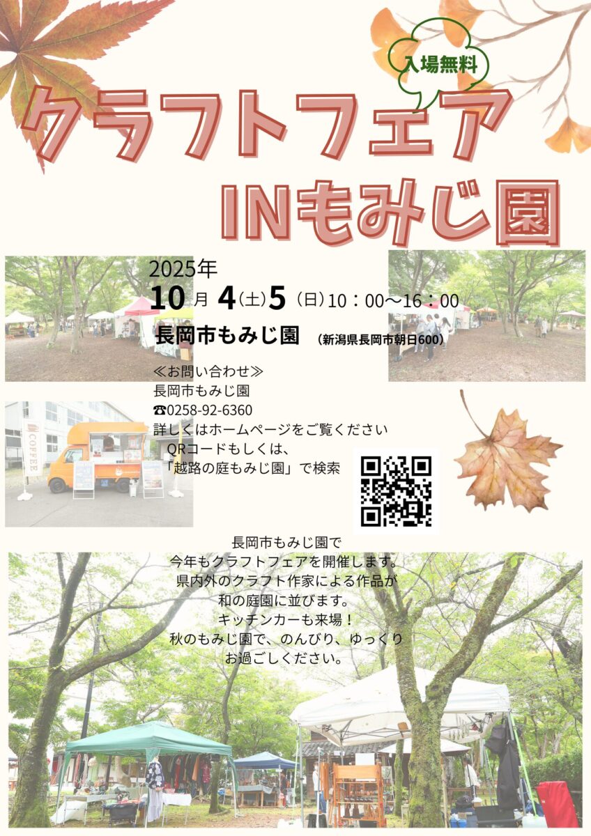 もみじ園は、新潟県長岡市の越路地区にある和の庭園で、約400本もの樹木が植えられており、樹齢150年以上の木もある歴史ある庭園です。庭園内には“旧高橋家別荘”の迎賓館建物(登録有形文化財)があり、建築好きにも見応えがあります。四季折々の風景が美しく、秋の紅葉シーズンには色づきが見事。クラフトフェアの開催時期はちょうどその魅力が高まるタイミングで、庭園散策と物づくりとの融合が楽しめます。ゆるやかな丘や小径が庭を巡るように配置されており、作品を見ながら散歩するように歩くのも心地よいでしょう。もみじ園内には「丘の上の迎賓館」「高九蔵Cafe」など休憩スポットもあり、展示散策の合間にほっと一息つけます。