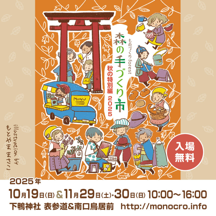 京都・下鴨神社で毎年恒例となっている「森の手づくり市~秋の特別編~」が、2025年10月19日(日)と11月29日(土)・30日(日)に開催されます。世界遺産「糺の森」を舞台に、アクセサリーや布小物、陶器、革小物など、心のこもった手づくり作品が3日間で570ブースも並び、訪れる人をあたたかく迎えてくれます。さらにキッチンカーも集まり、焼き菓子やパン、ドリンクなど出来立ての味を楽しむことができるのも魅力のひとつ。森の音楽会も同時開催され、生演奏とともにショッピングや食事を満喫できる、秋ならではの特別なイベントです。