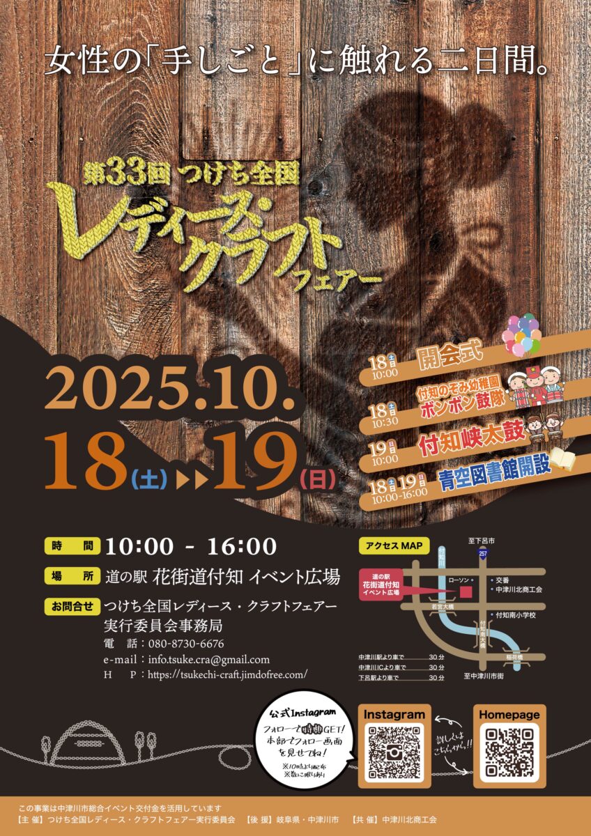 岐阜県中津川市・付知町の「道の駅 花街道 付知」イベント広場にて、2025年10月18日(土)・19日(日)に、女性クラフト作家だけが集う特別なクラフトフェアが開催されます。木工・陶芸・ガラス・染織・布もの・金属など、多彩なジャンルの作品が揃い、オリジナル作品を手に取れる貴重な機会。秋の高原風景と手しごとの調和を感じる2日間です。イベントの特徴と魅力