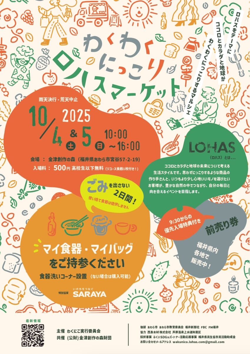 福井県あわら市の「金津創作の森」を舞台に、ロハス(健康・環境・持続可能性)をテーマにしたマルシェイベント「わくわくにっこりロハスマーケット」が、2025年10月4日(土)・5日(日)に開催されます。クラフト作品や地元食材、ワークショップ、親子で楽しめる遊び企画などがぎゅっと詰まった2日間。自然豊かな森の中で、「自分らしい暮らし」を見つけたり、小さな発見と出会える時間になること間違いなしです。